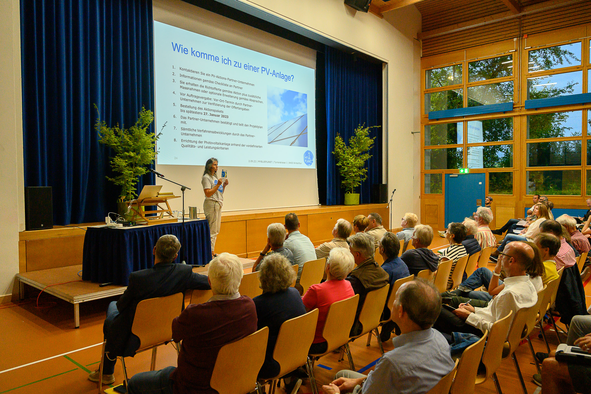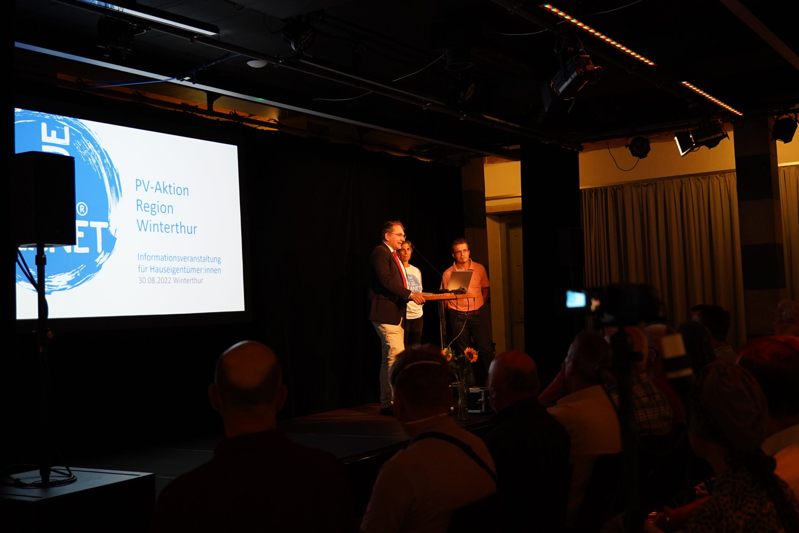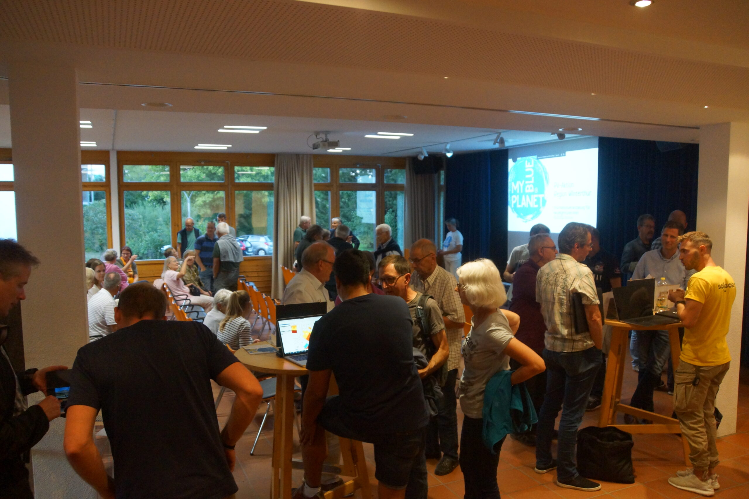 Die 170 gestuhlten Plätze waren schnell besetzt. Etwa 250 BesucherInnen fanden den Weg in die Alte Kaserne, wir sind begeistert! Auf die Ansprache von Stadtrat Stefan Fritschi folgte der Infoteil unserer Kampagnenleiterin Ina Paschen, fachmännisch unterstützt von Martin Ovenstone der Energiewendegenossenschaft Winterthur. Nach dem offiziellen Teil übernahmen unsere Solar-Installateure das Ruder und kümmerten sich um die Anliegen der Besucher:innen. Die acht anwesenden Partnerunternehmen nahmen neben interessanten Gesprächen bereits viele Anfragen mit. 115 Getränke wurden von den Volunteers von MYBLUEPLANET herausgegeben und mindestens so viele interessante Gespräche geführt. Besten Dank an alle Mitwirkenden für diesen gelungenen Auftakt!