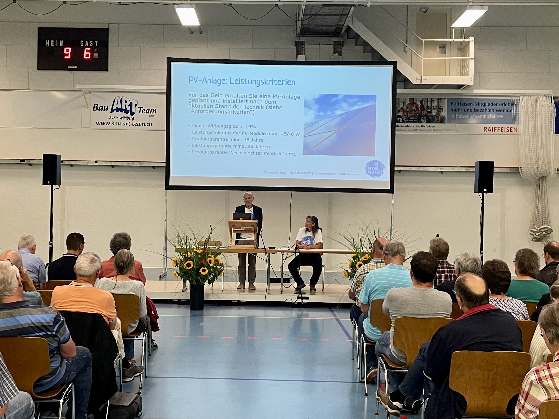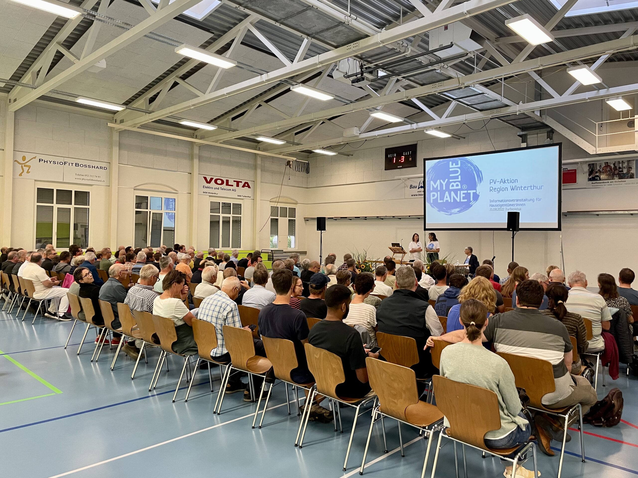 Die Wisenthalle platzte fast: über 300 (manche sprachen von 400) Besucher:innen! Rekord in unserer Veranstaltungsserie! Sie lauschten gespannt dem Referat und brachten viele Fragen mit.Neben MYBLUEPLANET und den Partner-Unternehmen war die gesamte Energiekommission sowie Vertreter:innen aus Gemeinderat und Verwaltung anwesend. Während des Apéros waren neben den Partnern auch sie in Gespräche mit dem Publikum vertieft, gaben Antworten und diskutierten Ansätze zur Verbesserung. Herzlichen Dank an alle Mitwirkenden für diesen gelungenen Abend!