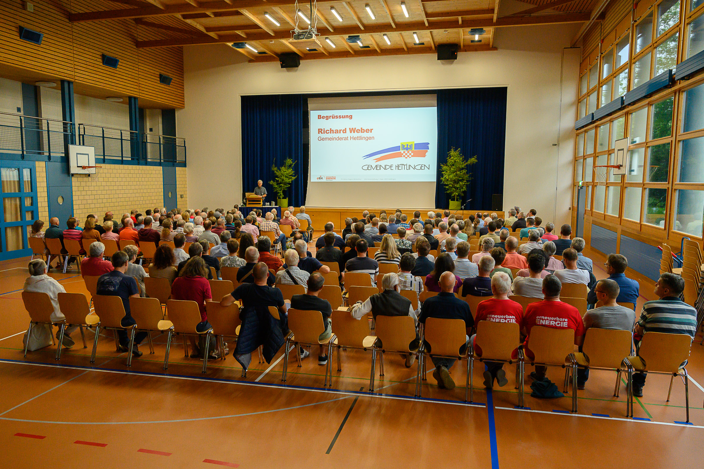 Gemeinsam mit Seuzach lud Hettlingen am Freitagabend zum Info-Anlass ein, fast so viele wie in Winterthur fanden sich ein, wir schätzen ca. 210 Leute aus allen Altergruppen. Viele spannende Fragen wurden gestellt von Kernzone über Brandschutz, Schnee und Gebäudeversicherung, bei denen die Partner ihre Expertise bereits im Plenum einbringen konnten. Im anschliessenden Apéro wurde rege vertieft und diskutiert. Neben den Gemeindevertretern möchten wir dem Verein erneuerbare Energie Hettlingen herzlich für ihr Engagement und die Gesamtkoordination der gelungenen Veranstaltung danken!